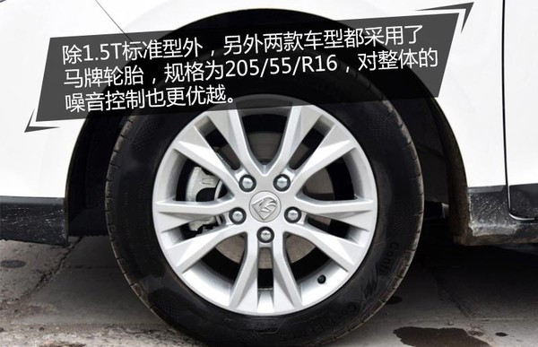除1.5T标准型外,另外两款车型都采用了马牌轮胎,规格为205/55/R16,对整体的噪音控制也更优越。