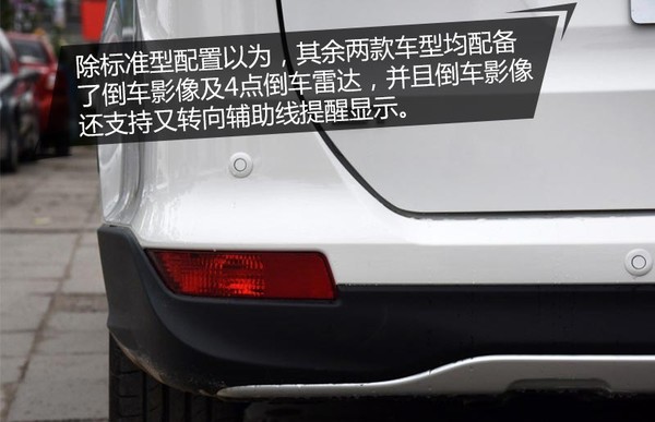 除标准型配置以为,其余两款车型均配备了倒车影像及4点倒车雷达,并且倒车影像还支持又转向辅助线提醒显示。