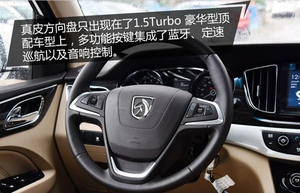 真皮方向盘只出现在了1.5Turbo 豪华型顶配车型上,多功能按键集成了蓝牙、定速巡航以及音响控制。