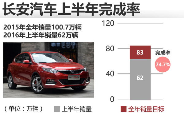 2015年长安汽车全年累计销量为100.7万辆,2016年上半年销售62万辆,2016年的销量目标为83万辆,完成率74.7%。