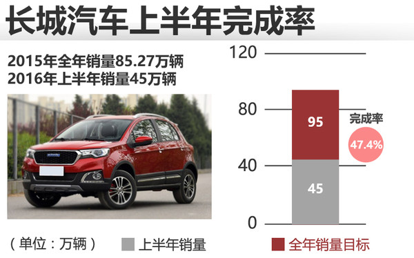 2015年长城汽车全年累计销量为85.27万辆,2016年上半年销售45万辆,2016年的销量目标为95万辆,完成率47.4%。