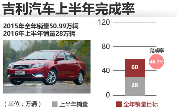 2015年吉利汽车全年累计销量为50.99万辆,2016年上半年销售28万辆,2016年的销量目标为60万辆,完成率46.7%。