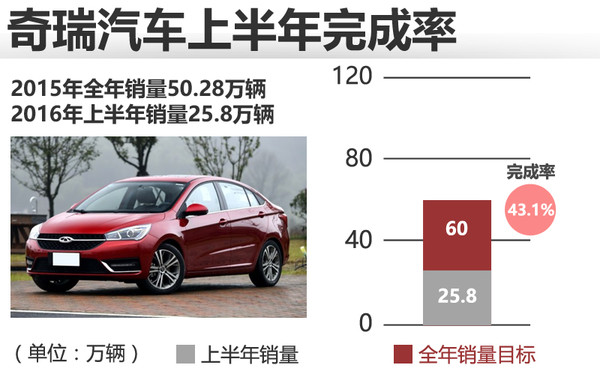 2015年奇瑞汽车全年累计销量为50.28万辆,2016年上半年销售25.8万辆,2016年的销量目标为60万辆,完成率43.1%。
