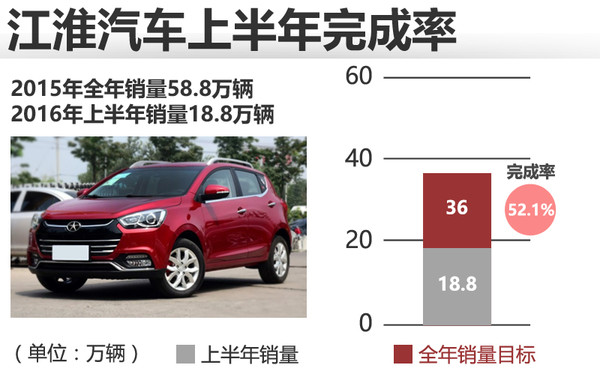 2015年江淮汽车全年累计销量为58.8万辆,2016年上半年销售18.8万辆,2016年的销量目标为36万辆,完成率52.1%。