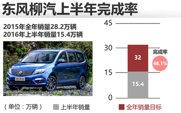 2015年东风柳汽全年累计销量为28.2万辆,2016年上半年销售15.4万辆,2016年的销量目标为32万辆,完成率48.1%。