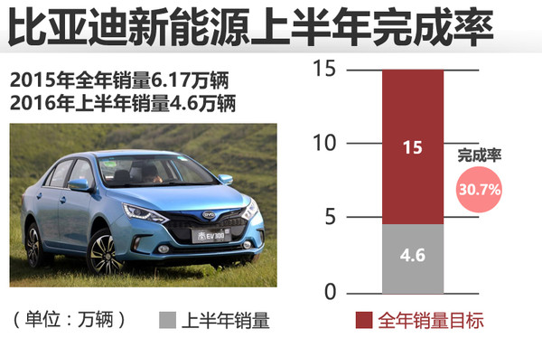 2015年比亚迪新能源全年累计销量为6.17万辆,2016年上半年销售4.6万辆,2016年的销量目标为15万辆,完成率30.7%。