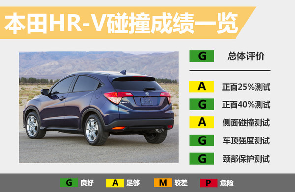 参加碰撞测试的车型为美版2016款本田HR-V。IIHS的碰撞测试项目分为5大项,其中正面40%碰撞测试、顶部碰撞测试以及颈部保护测试等3大项考核,HR-V的总评成绩均拿到最高评分"G"(良好);正面25%碰撞测试和侧面碰撞测试的总评成绩只拿到“A”(足够)。下面我们就为大家多角度解析新车在各项碰撞测试中的表现。(注:在美国参加测试车型的最终碰撞成绩仅供消费者参考)