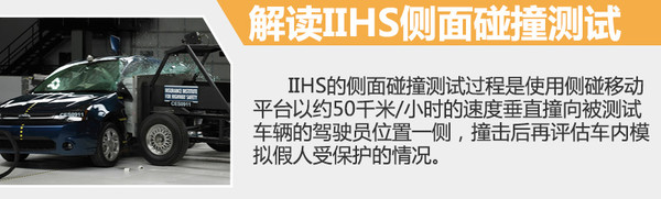 IIHS的侧面碰撞测试过程是使用重达1.5吨的侧碰移动平台,以50千米/小时的速度撞向受测试车辆驾驶员位置一侧,之后通过专业仪器检测车内模拟驾驶员假人以及后排座椅上模拟乘客假人的受保护程度。