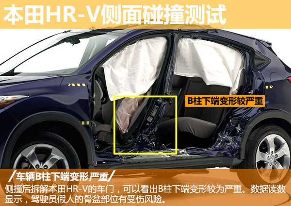 本田HR-V在受到侧面撞击后,驾驶员一侧的车门严重变形,拆解前后车门后可以看出车辆的B柱下端已发生严重变形入侵。虽然驾驶座配备的侧面安全气囊正常弹出,但数据读数显示模拟驾驶员假人的骨盆有受伤风险。侧撞中,HR-V后排座椅上的乘客假人受到了良好的防护。