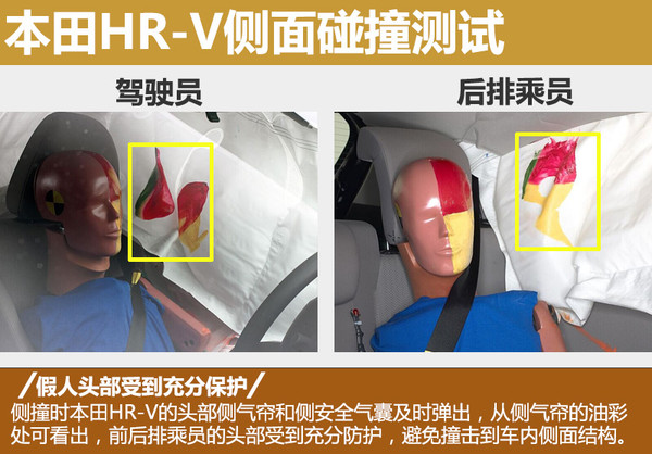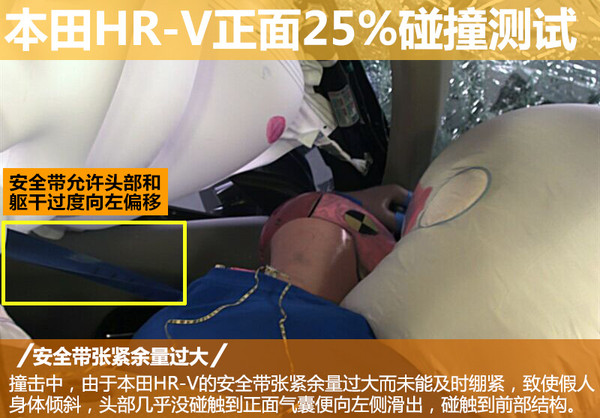 在撞击发生时,由于HR-V的安全带张紧余量过大而未能及时绷紧,致使假人身体倾斜,头部几乎没碰触到正面气囊便向左侧滑出碰触到前部结构,但数据读数显示头部并未受到伤害。新车装备的头部侧安全气帘及时弹出并有足够的覆盖面,降低了假人头部接触到车内侧面结构的风险。