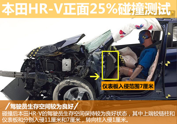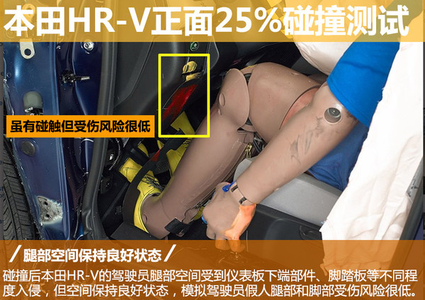HR-V经撞击后驾驶员腿部空间保持了较为良好状态,虽有车门边框、下铰链柱和脚踏板等部件入侵,但均在安全范围之内;虽然碰撞中假人膝部和腿部与仪表板下端部件有碰触,但碰撞后数据读数显示模拟驾驶员假人以上部位并未受到伤害。