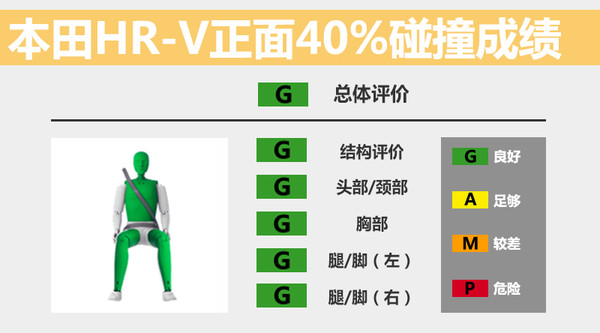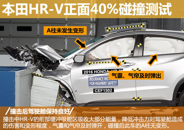 本田HR-V的正面40%碰撞测试总评成绩和各小项成绩均为良好。撞击中此车的前部缓冲吸能区吸收大部分正碰能量,降低冲击力对驾驶舱造成的伤害和变形程度,撞击后A柱并未变形。此外,HR-V的正面安全气囊、侧气帘以及侧安全气囊均及时弹开,为车内乘员提供进一步防护。