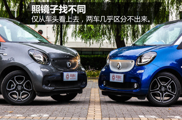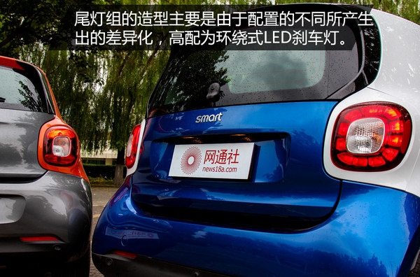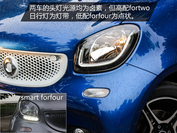如果仅从车头看上去,两车如出一辙,肉眼并不好分辨出来。新一代smart灵动的设计在这两车上都有体现。萌萌的大眼睛采用的是卤素光源,算不上有档次,smart本来也不是追求档次感的车,如果想要更“大气”,回头左转那边有家奔驰4S店。高配车型的日行灯为LED灯带,其余为点阵式LED光源。