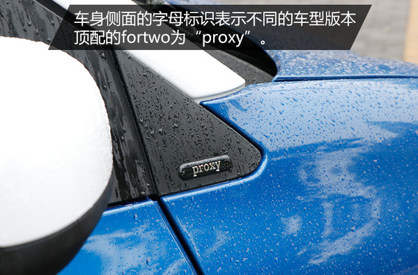 转入车身侧面,fortwo和forfour的差异就能明显的看出来,同样的双拼配色,多出来两门的forfour修长了不少。由于固化在脑海中的印象,“加长”版的smart比例看上去多少感觉有些不协调,缺少了几分灵动的感觉。此外在A柱三角区的英文“proxy”表明这是一台顶配的smart fortwo 0.9T极致版,另一台forfour为“prime”0.9T先锋版并非顶配车型。