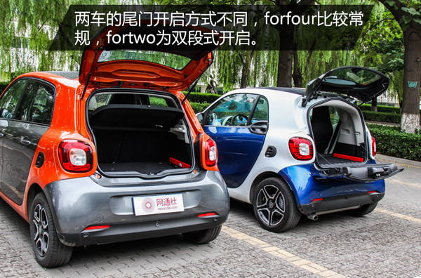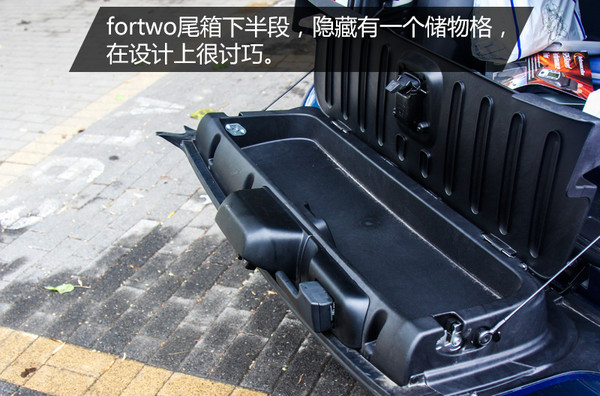 车尾算是两车最大的不同之处,这并不仅仅局限于牌照架位置的不同。要说到底有何不同,forfour的尾门是传统一体的开启方式,这与普通车型并无太大差异。而fortwo要想打开后备箱,首先要将玻璃打开,然后下半段的尾门才能真正打开,并且为了弥补尾箱空间的不足,在后门板出还隐藏了一个储物格,设计很讨巧。