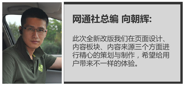 针对此次改版网通社总编向朝辉表示:此次全新改版的出发点基于让用户拥有更好的体验、给用户输出更有兴趣的内容、向用户提供更加实用化的用车服务,因此我们在页面设计、内容板块、内容来源三个方面进行精心的策划与制作,希望给用户带来不一样的体验。