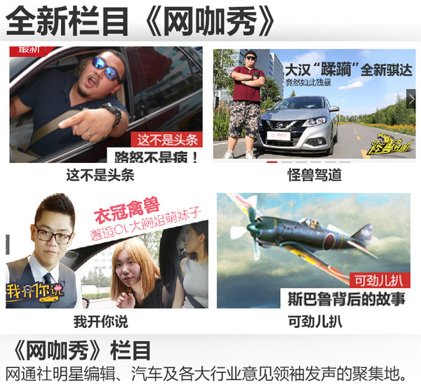 《网咖秀》作为此次页面改版的全新栏目,将为用户全方位的呈现更多标新立异的内容。网咖秀栏目将成为网通社明星编辑、汽车及各大行业意见领袖发声的聚集地。在这里,你将会看到《这不是头条》、《怪兽驾道》、《70侃90逗》、《我开你说》、《可劲儿扒》等多个精彩栏目,这里将聚集用户所想看、所爱看、所会看的优质内容,《网咖秀》将秉承优秀内容集合体的概念成为网通社内容产品中的新兴力量。