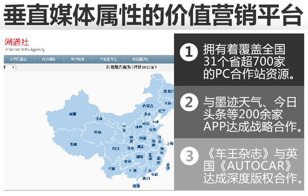 网通社作为具有垂直媒体属性的价值营销平台,不仅拥有业内最快速化的原创新闻资讯、多元化的的原创内容,更拥有着覆盖全国31个省超700家的PC合作站资源,并与包括墨迹天气、今日头条等200余家优质APP达成战略合作,同步收购了在华首本汽车专业杂志《车王杂志》并与英国《AUTOCAR》达成深度版权合作,在与360汽车品牌专区达成独家战略签约、通讯与银行领域跨界合作后,基于强大的用户数据源网通社已组建成为了精准化、个性化、深度化、原创化的整合立体营销平台,而今全新改版的正式上线标志着网通社以用户触媒习惯、个性兴趣阅读、消费者体验为导向的全新营销理念全面推行。