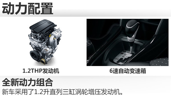 东风标致新款2008将增搭PSA集团旗下的1.2THP直列三缸涡轮增压发动机。这台小排量增压发动机的最大功率为100千瓦,峰值扭矩达到230牛米,综合工况下百公里综合油耗仅为5.3升。传动部分,新款2008将匹配6速手自一体变速箱。