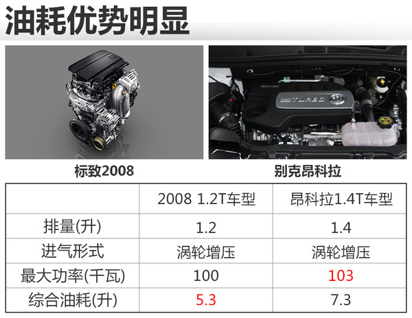 标致2008定位于小型SUV,通过与同级别车型别克昂科拉对比后发现,昂科拉所搭载的1.4升直列四缸涡轮增压发动机虽然排量较2008大了0.2升,但在功率上仅超出3千瓦,且油耗高出2升/百公里,新车在动力基本相同的情况下,燃油经济性较对手具备一定优势,可以说标致2008搭载的1.2T发动机已经领先了对手。(图/文网通社王静亚)