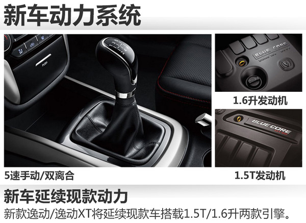 新款逸动将延续现款车型所搭载的1.5升直列四缸涡轮增压发动机和1.6升直列四缸自然吸气发动机,最大功率分别为125千瓦和92千瓦,峰值扭矩为230牛米和160牛米。传动系统除了匹配5速手动变速箱之外,新车还有望提供5速双离合变速箱供消费者选择。
