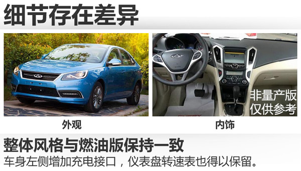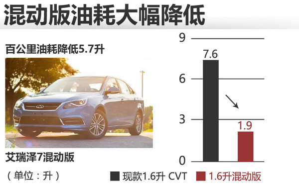 新车油箱容积55升,电池容量为9.2千瓦时。在纯电动状态下可行驶50公里,综合续驶里程可达930公里。采用充电桩进行充电时,电池充满一次仅需6个小时。与现款艾瑞泽7在售的1.6升自动挡车型相比,插电混动版车型的综合油耗从百公里7.6升降至1.9升。