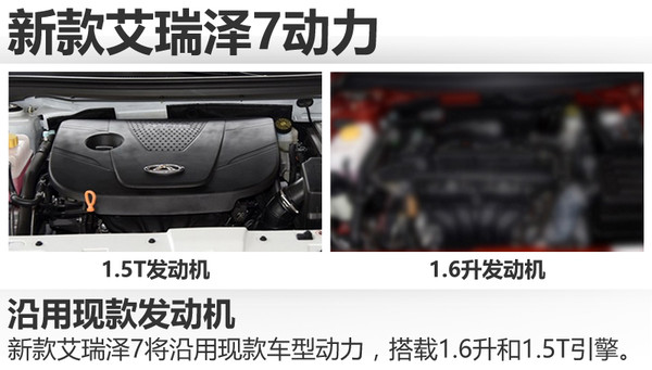 新款艾瑞泽7将沿用现款车型动力,搭载1.6DVVT自然吸气发动机与1.5TCI涡轮增压发动机。前者最大输出功率为93千瓦,峰值扭矩为160牛米;后者最大输出功率为112千瓦,峰值扭矩为205牛米。