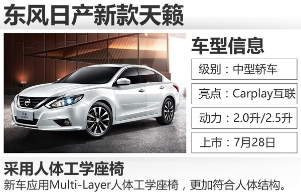 | 东风日产 | 新款天籁 | 中型轿车 | 7月28日 |