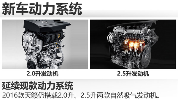 动力方面,2016款天籁将搭载2.0升、2.5升两款自然吸气发动机。其中,2.0升发动机经过调教后,最大功率110千瓦,相比现款车型增加7千瓦。而2.5升发动机最大功率为137千瓦,峰值扭矩为234牛米。此外,2.5升发动机还带有C-VTC连续可变气门正时智能控制系统。