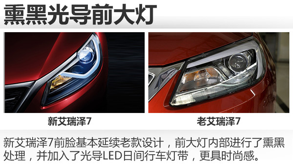 新艾瑞泽7前脸基本延续老款设计,仅在细节处进行了调整。新车前大灯内部进行了熏黑处理,并加入了光导LED日间行车灯带,更具时尚感。全新的“X”形前脸以及新增的镀铬饰条,都让新车更显年轻一些。