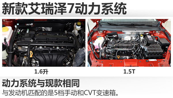 新艾瑞泽7动力系统依旧沿用1.6DVVT和1.5T两款发动机。其中1.6升自然吸气发动机最大功率为93千瓦,最大扭矩为160牛米;1.5T发动机最大功率为112千瓦,最大扭矩为205牛米。与发动机匹配的是5速手动变速箱以及CVT变速箱,并拥有多款不同的配置组合。