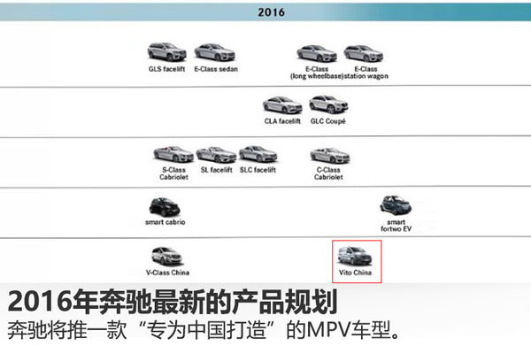 根据奔驰在海外曝光的最新产品规划来看,下半年将有多款车型投放市场。引人注意的是,在MPV车型方面,除了已经上市的V-Class外,奔驰将推出一款名为“Vito China”的车型。从命名上就可看出,新车将与全新V-Class一样,都是一款专为中国市场打造的车型,新车有望于今年第四季度上市。