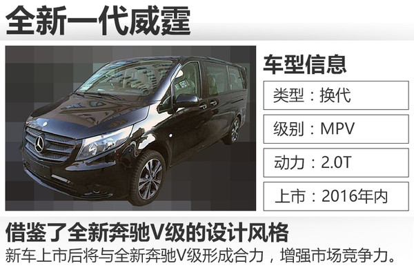 福建奔驰威霆是国内为数不多的一款豪华MPV,自2010年上市以来,已走过了6个年头。网通社从近期曝光的奔驰产品计划中了解到,奔驰将推一款专为中国打造的MPV车型——“Vito China”。新车在外观方面借鉴了全新奔驰V级车型的设计理念,并换装了全新的动力系统。另外,从时间轴上来看新车有望于第四季度国内上市。