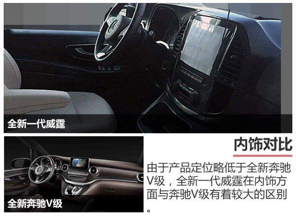 由于产品定位低于全新奔驰V级,全新一代威霆在内饰方面与全新奔驰V级有着较大的区别。中控台取消了独立液晶显示屏以及全新的COMAND系统,且在内饰用料方面质量也有所下降,应用更多的塑料件来进行装饰,豪华感有所降低。