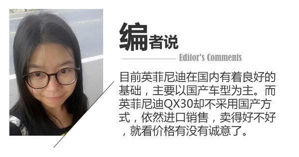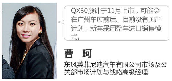 关于具体的上市时间以及是否以国产方式推出,东风英菲尼迪汽车有限公司市场及公关部市场计划与战略高级经理曹珂在与网通社沟通时表示:“QX30预计于11月上市,可能会在广州车展前后。目前没有国产计划,新车采用整车进口销售模式。”QX30推出后,将进一步丰富英菲尼迪在SUV细分市场的阵容。