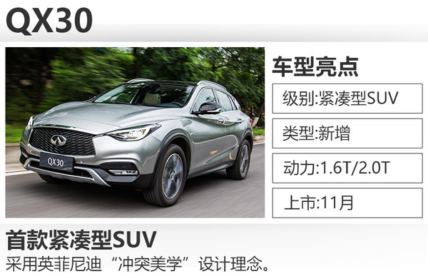 英菲尼迪QX30采用英菲尼迪“冲突美学”设计理念,造型时尚、前卫。QX30在动力方面搭载的是与Q50相同的2.0T涡轮增压发动机,满足一款紧凑型SUV对于动力输出的需求。英菲尼迪QX30将凭借运动外观以及强劲的动力输出,有望在豪华品牌紧凑型SUV细分市场中获得理想的市场表现。