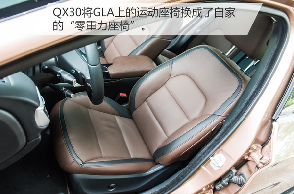 QX30车内有五个座,其中后排中间那个座等于没有。奔驰GLA上前面两个运动座椅被换成了日产自家的“零重力座椅”,侧向支撑稍欠,舒适度大幅提升。QX30前后排待遇可以拿商务舱与经济舱做比,后排座椅又直又硬,头部空间与腿部空间非常有限,坐垫长度也不够,不适合长时间乘坐。