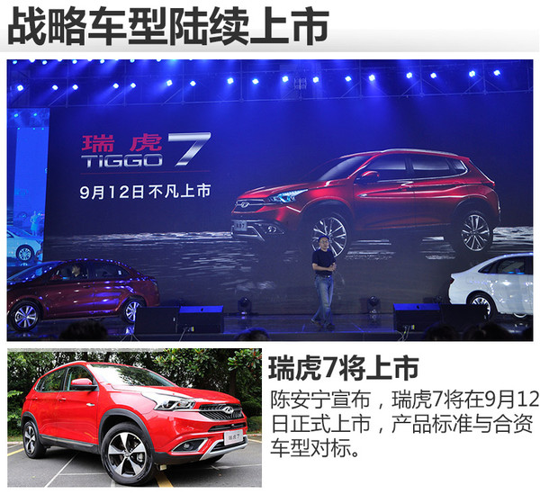 同时陈安宁宣布,战略2.0的首款SUV瑞虎7决定在9月12日正式上市,这也将是一款高颜值,高品质,高性能,超越合资标准的代表产品。此外,瑞虎3X有望于年底上市,瑞虎1则将在明年初正式登陆市场,届时,奇瑞的4款全新战略产品将领跑奇瑞家族。