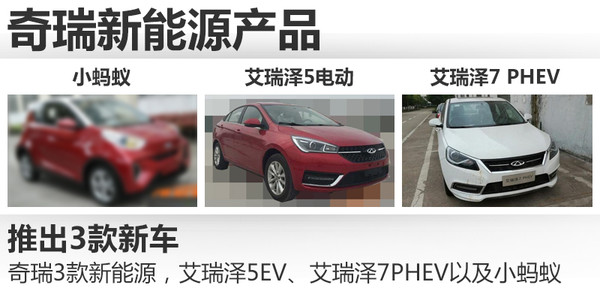 奇瑞目前已向市场推出了eQ等新能源产品,2015年,奇瑞新能源产品累计销量1.41万辆。在今年,奇瑞将在新能源领域推出3款新车,包括在已经上市的艾瑞泽7e,还有将上市的微型纯电动车——小蚂蚁和艾瑞泽5EV版,后者上市时间暂未确定。(
