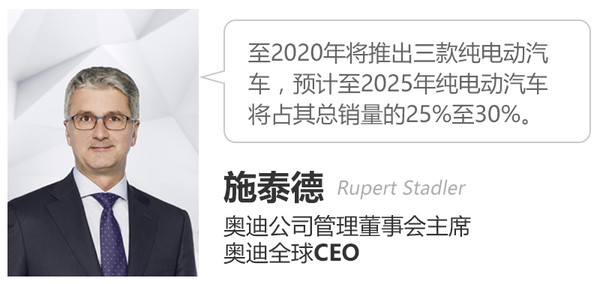 奥迪CEO施泰德曾表示:奥迪计划至2020年将推出三款纯电动汽车,预计至2025年纯电动汽车将占其总销量的25%至30%。另一方面,根据此前公布的消息,奥迪纯电动SUV车型将在奥迪e-tron Quattro纯电动概念SUV基础上打造,并有望在比利时的奥迪工厂进行投产。