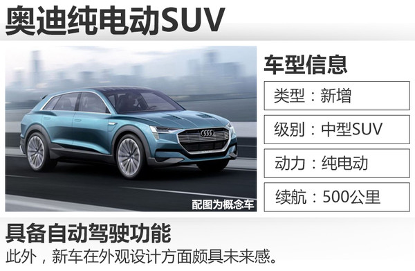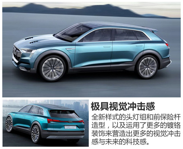 纯电动SUV将在奥迪e-tron Quattro纯电动概念SUV基础上打造。早在去年法兰克福车展的大众之夜上,奥迪就曾对外公布了全新的e-tron Quattro纯电动概念SUV,这款豪华概念电动SUV续航里程达到500公里,并且拥有自动驾驶功能。此外,新车在外观设计方面颇具未来感。