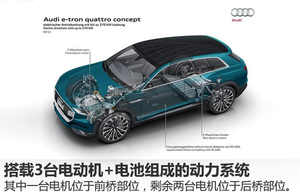 动力方面,奥迪纯电动SUV有望采用奥迪e-tron Quattro概念车的动力系统。奥迪e-tron Quattro概念车搭载的是3台电动机+电池组成的动力系统,其中一台电机位于前桥部位,剩余两台电机位于后桥部位。3台电动机总共可输出320千瓦的最大功率,高功率版甚至可达到370千瓦。续航里程方面,奥迪e-tron Quattro概念车将会搭载一套锂离子电池组,综合续航里程为500公里。(图/文网通社郭王虎)