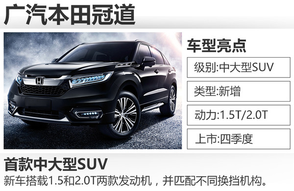 广汽本田冠道曾于北京车展前夕的广本之夜上正式发布,新车定位于中大型SUV。根据官方公布的消息,冠道将于今年第四季度上市,上市之后将进一步丰富广汽本田SUV的产品阵容。网通社走访北京多家广汽本田授权经销商了解到:冠道现已接受预订,订金500元到上千元不等,实车将于10月到店。