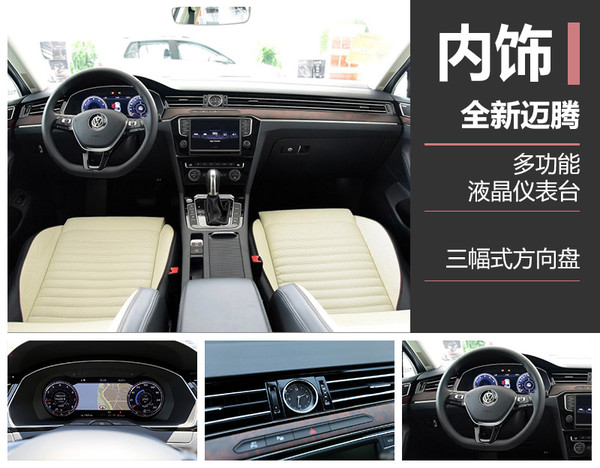 在延续了一部分家族化设计的基础之上,全新一代迈腾对内饰进行了全面升级与重新设计。与老款不同的是,新款将经典的圆形石英钟镶嵌在全新设计的一体式空调出风口上,彰显阔气与豪华。镀铬多功能按钮被安放在三幅式平底多功能方向盘的两侧,给予驾驶者不一样的触感与不一样的体验。