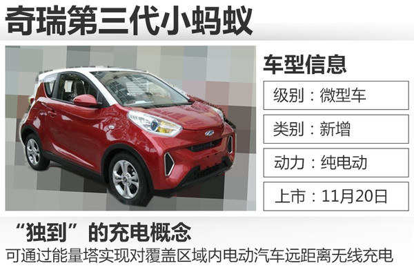 新车将搭载一台可输出41马力的电动机,续航里程有望超过150公里。此外奇瑞小蚂蚁提出“独到”的充电概念,官方称小蚂蚁可通过能量塔实现对覆盖区域内电动汽车的远距离无线充电,为电动汽车提供能量补给,同时能量区域外非接触式组合充电可以满足电动汽车能量的应急补给。