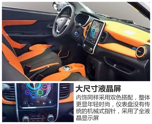 内饰方面,新车采用了双色搭配,整体更显年轻时尚,仪表盘没有传统的机械式指针,采用了全液晶显示屏,同时中控台部分也配备大尺寸的液晶显示屏,且整合了众多娱乐系统功能,而在空调出风口附近,贴有显示特殊身份的“EQ”标识。此外新车还使用旋钮式换挡机构,使科技感得到提升
