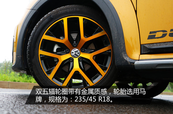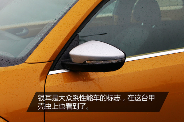 侧部下裙的黑色边框立体感强,底盘边缘依然有银色护板装饰。双五辐轮圈不是明晃晃的亮黄,而是和车身同色,骚气的不是那么张扬,并且还透着金属质感,银耳是大众系性能车的标志,不过在这个1.4T排量的甲壳虫上也看到了。