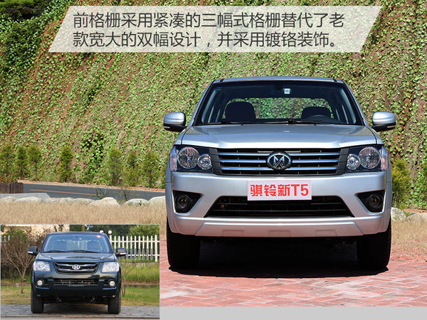 外观方面新车采用中庸方正的造型,相比现款车型,骐铃新T5对前脸做出一定的调整,前格栅采用紧凑的三幅式格栅替代了老款宽大的双幅设计,中央镶嵌江铃集团轻汽的LOGO,并配以镀铬饰件装饰。