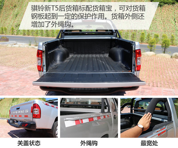 骐铃新T5后货箱标配货箱宝,可对货箱钢板起到一定的保护作用。货架外包裹黑色硬塑料,最宽部分与成年人手掌宽度相当。同时在货箱外侧还增加了外绳钩,方便捆绑货物。在轿厢后还较为厚道的配备了高位刹车灯。