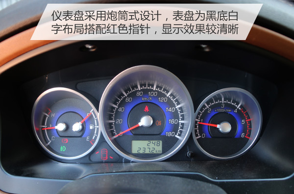 仪表盘采用炮筒式设计,表盘为黑底白字布局搭配红色指针,显示效果比较清晰。开启示宽灯后显示蓝色背光,较为动感。此外,还拥有安全带未系提示和车门未关提示指示灯。